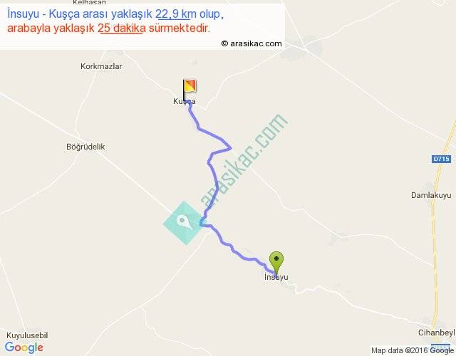 İnsuyu - Kuşça arası yaklaşık olarak 90 km/h ile yukarıda belirtilen sürede olup, iki yerin kuş uçuşu uzaklığı (mesafesi) 16'dir. Yolculuk otobüsle 32 dakika sürmektedir.