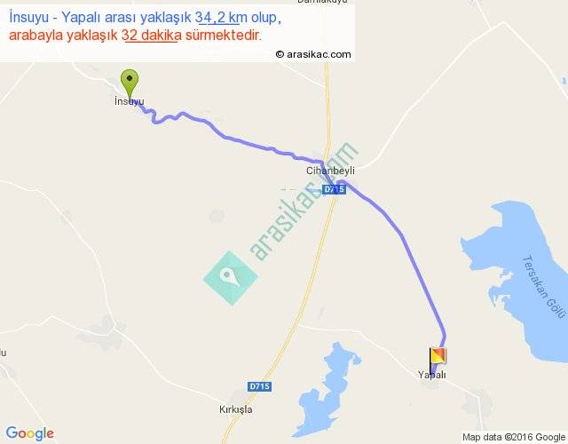 İnsuyu - Yapalı arası yaklaşık olarak 90 km/h ile yukarıda belirtilen sürede olup, iki yerin kuş uçuşu uzaklığı (mesafesi) 27'dir. Yolculuk otobüsle 41 dakika sürmektedir.