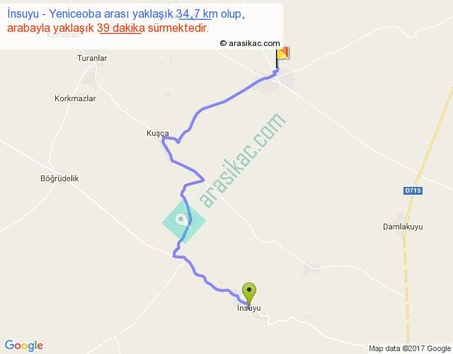 İnsuyu - Yeniceoba arası yaklaşık olarak 90 km/h ile yukarıda belirtilen sürede olup, iki yerin kuş uçuşu uzaklığı (mesafesi) 20'dir. Yolculuk otobüsle 50 dakika sürmektedir.
