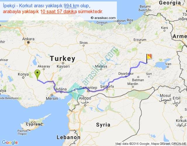 İpekçi - Korkut arası yaklaşık olarak 90 km/h ile yukarıda belirtilen sürede olup, iki yerin kuş uçuşu uzaklığı (mesafesi) 723'dir. Eğer belirtilen yerler arasında uçak seferi var ise bu süre uçakla 1 saat 06 dakika'ya kadar düşebilir. Yolculuk otobüsle 14 saat 14 dakika sürmektedir.