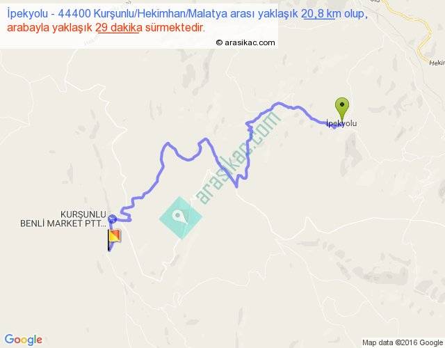İpekyolu - 44400 Kurşunlu Hekimhan Malatya arası yaklaşık olarak 90 km/h ile yukarıda belirtilen sürede olup, iki yerin kuş uçuşu uzaklığı (mesafesi) 11'dir. Yolculuk otobüsle 37 dakika sürmektedir.