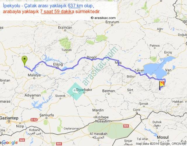 İpekyolu - Çatak arası yaklaşık olarak 90 km/h ile yukarıda belirtilen sürede olup, iki yerin kuş uçuşu uzaklığı (mesafesi) 448'dir. Eğer belirtilen yerler arasında uçak seferi var ise bu süre uçakla 41 dakika'ya kadar düşebilir. Yolculuk otobüsle 10 saat 22 dakika sürmektedir.