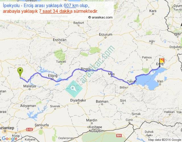 İpekyolu - Erciş arası yaklaşık olarak 90 km/h ile yukarıda belirtilen sürede olup, iki yerin kuş uçuşu uzaklığı (mesafesi) 465'dir. Eğer belirtilen yerler arasında uçak seferi var ise bu süre uçakla 42 dakika'ya kadar düşebilir. Yolculuk otobüsle 9 saat 50 dakika sürmektedir.
