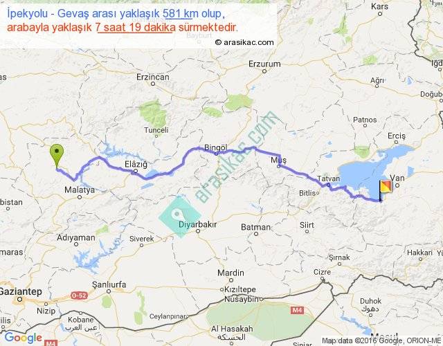 İpekyolu - Gevaş arası yaklaşık olarak 90 km/h ile yukarıda belirtilen sürede olup, iki yerin kuş uçuşu uzaklığı (mesafesi) 447'dir. Eğer belirtilen yerler arasında uçak seferi var ise bu süre uçakla 41 dakika'ya kadar düşebilir. Yolculuk otobüsle 9 saat 30 dakika sürmektedir.
