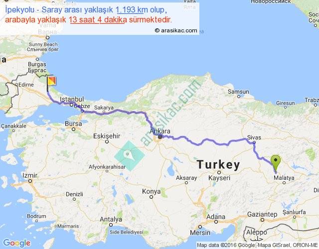 İpekyolu - Saray arası yaklaşık olarak 90 km/h ile yukarıda belirtilen sürede olup, iki yerin kuş uçuşu uzaklığı (mesafesi) 902'dir. Eğer belirtilen yerler arasında uçak seferi var ise bu süre uçakla 1 saat 23 dakika'ya kadar düşebilir. Yolculuk otobüsle 16 saat 59 dakika sürmektedir.