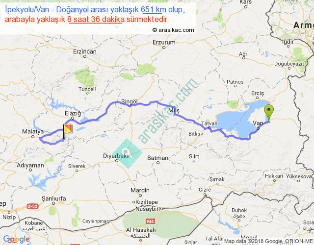 İpekyolu Van - Doğanyol arası yaklaşık olarak 90 km/h ile yukarıda belirtilen sürede olup, iki yerin kuş uçuşu uzaklığı (mesafesi) 398'dir. Eğer belirtilen yerler arasında uçak seferi var ise bu süre uçakla 36 dakika'ya kadar düşebilir. Yolculuk otobüsle 11 saat 10 dakika sürmektedir.