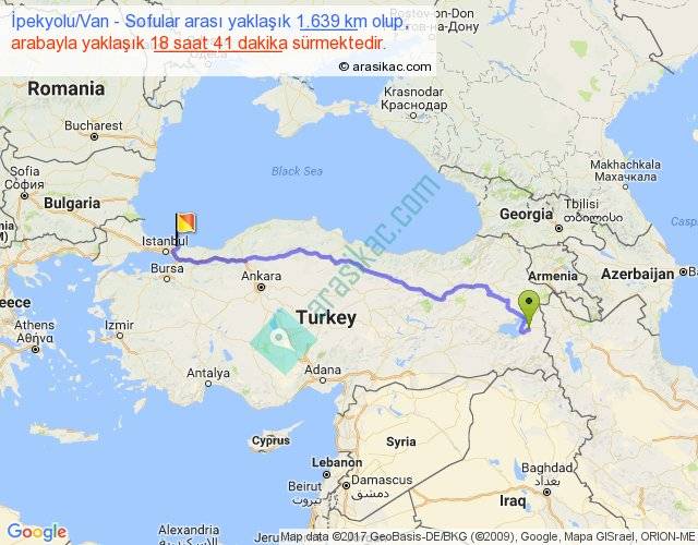 İpekyolu Van - Sofular arası yaklaşık olarak 90 km/h ile yukarıda belirtilen sürede olup, iki yerin kuş uçuşu uzaklığı (mesafesi) 1230'dir. Eğer belirtilen yerler arasında uçak seferi var ise bu süre uçakla 1 saat 53 dakika'ya kadar düşebilir. Yolculuk otobüsle 1 gün 0 saat sürmektedir.