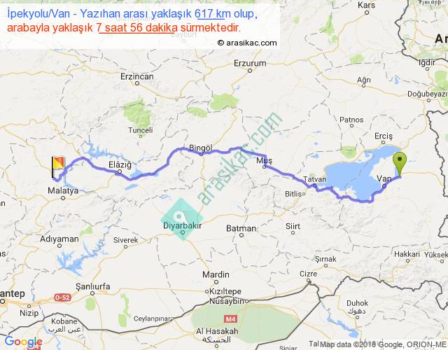 İpekyolu Van - Yazıhan arası yaklaşık olarak 90 km/h ile yukarıda belirtilen sürede olup, iki yerin kuş uçuşu uzaklığı (mesafesi) 470'dir. Eğer belirtilen yerler arasında uçak seferi var ise bu süre uçakla 43 dakika'ya kadar düşebilir. Yolculuk otobüsle 10 saat 18 dakika sürmektedir.