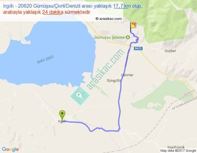 Irgıllı - 20620 Gümüşsu Çivril Denizli arası yaklaşık olarak 90 km/h ile yukarıda belirtilen sürede olup, iki yerin kuş uçuşu uzaklığı (mesafesi) 11'dir. Yolculuk otobüsle 31 dakika sürmektedir.