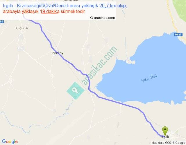 Irgıllı - Kızılcasöğüt Çivril Denizli arası yaklaşık olarak 90 km/h ile yukarıda belirtilen sürede olup, iki yerin kuş uçuşu uzaklığı (mesafesi) 19'dir. Yolculuk otobüsle 24 dakika sürmektedir.