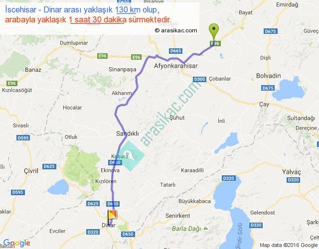 İscehisar - Dinar arası yaklaşık olarak 90 km/h ile yukarıda belirtilen sürede olup, iki yerin kuş uçuşu uzaklığı (mesafesi) 101'dir. Yolculuk otobüsle 1 saat 57 dakika sürmektedir.