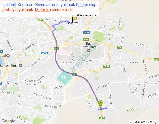 Eğer Işıkkent Köprüsü Bornova arası ne kadar yakar (benzin/mazot) diyorsanız, kilometrede 3 ₺ yakan bir aracınız var ise 27, km'de 4 ₺ yakan bir aracınız var ise 36, km'de 5 ₺ yakan bir aracınız var ise 45 ile bu yolculuğu tamamlayabilirsiniz.