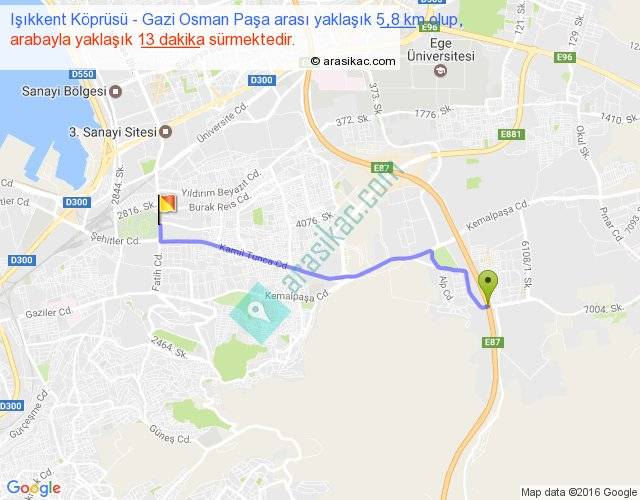 Işıkkent Köprüsü - Gazi Osman Paşa arası yaklaşık olarak 90 km/h ile yukarıda belirtilen sürede olup, iki yerin kuş uçuşu uzaklığı (mesafesi) 5'dir. Yolculuk otobüsle 16 dakika sürmektedir.