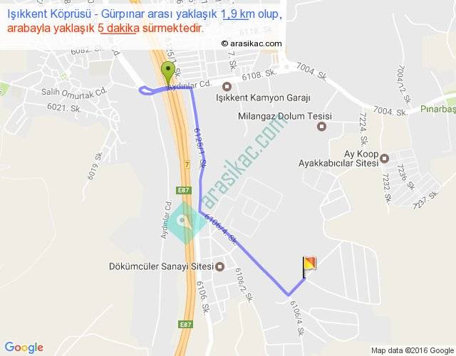 Işıkkent Köprüsü - Gürpınar arası yaklaşık olarak 90 km/h ile yukarıda belirtilen sürede olup, iki yerin kuş uçuşu uzaklığı (mesafesi) 1'dir. Yolculuk otobüsle 6 dakika sürmektedir.