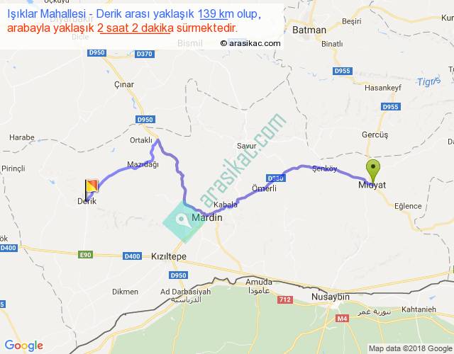 Işıklar Mahallesi - Derik arası yaklaşık olarak 90 km/h ile yukarıda belirtilen sürede olup, iki yerin kuş uçuşu uzaklığı (mesafesi) 98'dir. Yolculuk otobüsle 2 saat 38 dakika sürmektedir.