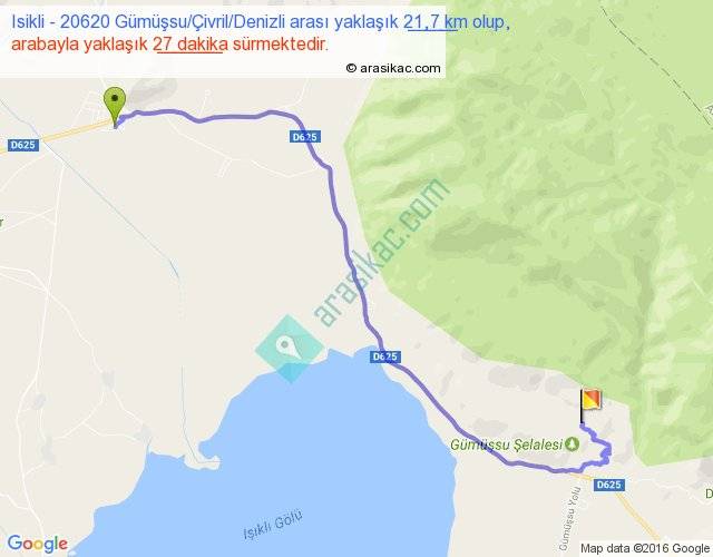 Isikli - 20620 Gümüşsu Çivril Denizli arası yaklaşık olarak 90 km/h ile yukarıda belirtilen sürede olup, iki yerin kuş uçuşu uzaklığı (mesafesi) 15'dir. Yolculuk otobüsle 35 dakika sürmektedir.