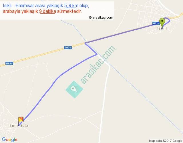 Isikli - Emirhisar arası yaklaşık olarak 90 km/h ile yukarıda belirtilen sürede olup, iki yerin kuş uçuşu uzaklığı (mesafesi) 5'dir. Yolculuk otobüsle 11 dakika sürmektedir.