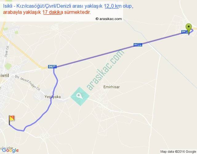Isikli - Kızılcasöğüt Çivril Denizli arası yaklaşık olarak 90 km/h ile yukarıda belirtilen sürede olup, iki yerin kuş uçuşu uzaklığı (mesafesi) 10'dir. Yolculuk otobüsle 22 dakika sürmektedir.