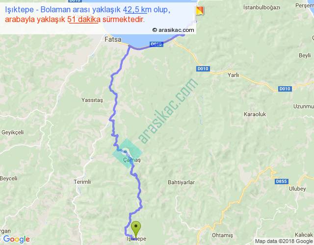 Işıktepe - Bolaman arası yaklaşık olarak 90 km/h ile yukarıda belirtilen sürede olup, iki yerin kuş uçuşu uzaklığı (mesafesi) 26'dir. Yolculuk otobüsle 1 saat 6 dakika sürmektedir.