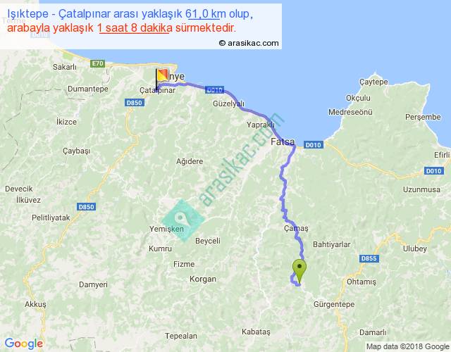 Işıktepe - Çatalpınar arası yaklaşık olarak 90 km/h ile yukarıda belirtilen sürede olup, iki yerin kuş uçuşu uzaklığı (mesafesi) 39'dir. Yolculuk otobüsle 1 saat 28 dakika sürmektedir.