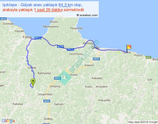 Işıktepe - Gülyalı arası yaklaşık olarak 90 km/h ile yukarıda belirtilen sürede olup, iki yerin kuş uçuşu uzaklığı (mesafesi) 47'dir. Yolculuk otobüsle 1 saat 51 dakika sürmektedir.