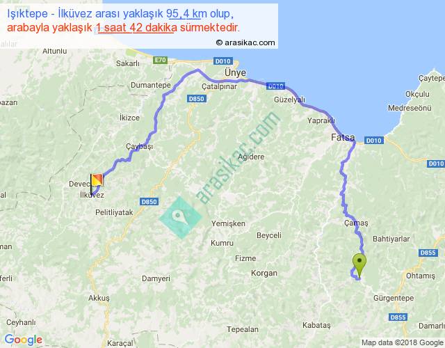 Işıktepe - İlküvez arası yaklaşık olarak 90 km/h ile yukarıda belirtilen sürede olup, iki yerin kuş uçuşu uzaklığı (mesafesi) 46'dir. Yolculuk otobüsle 2 saat 12 dakika sürmektedir.