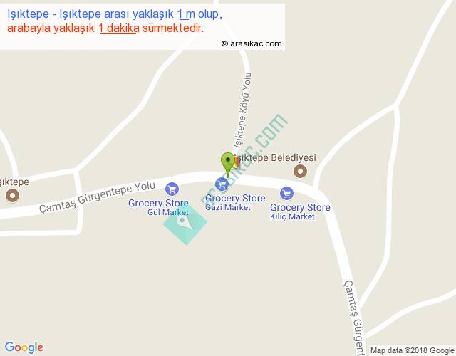 Işıktepe - Işıktepe arası yaklaşık olarak 90 km/h ile yukarıda belirtilen sürede olup, iki yerin kuş uçuşu uzaklığı (mesafesi) 0'dir. Yolculuk otobüsle 1 dakika sürmektedir.