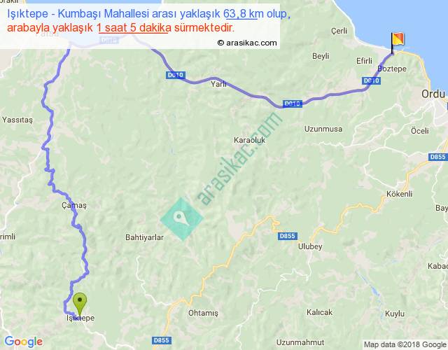 Işıktepe - Kumbaşı Mahallesi arası yaklaşık olarak 90 km/h ile yukarıda belirtilen sürede olup, iki yerin kuş uçuşu uzaklığı (mesafesi) 34'dir. Yolculuk otobüsle 1 saat 24 dakika sürmektedir.