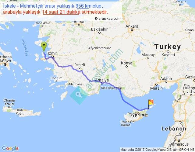İskele - Mehmetçik arası yaklaşık olarak 90 km/h ile yukarıda belirtilen sürede olup, iki yerin kuş uçuşu uzaklığı (mesafesi) 756'dir. Eğer belirtilen yerler arasında uçak seferi var ise bu süre uçakla 1 saat 09 dakika'ya kadar düşebilir. Yolculuk otobüsle 18 saat 39 dakika sürmektedir.