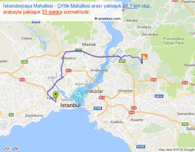 İskenderpaşa Mahallesi - Çiftlik Mahallesi arası yaklaşık olarak 90 km/h ile yukarıda belirtilen sürede olup, iki yerin kuş uçuşu uzaklığı (mesafesi) 18'dir. Yolculuk otobüsle 42 dakika sürmektedir.