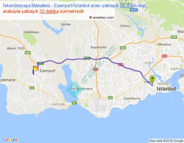 İskenderpaşa Mahallesi - Esenyurt İstanbul arası yaklaşık olarak 90 km/h ile yukarıda belirtilen sürede olup, iki yerin kuş uçuşu uzaklığı (mesafesi) 24'dir. Yolculuk otobüsle 42 dakika sürmektedir.