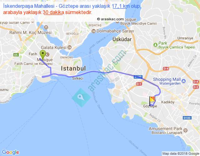 İskenderpaşa Mahallesi - Göztepe arası yaklaşık olarak 90 km/h ile yukarıda belirtilen sürede olup, iki yerin kuş uçuşu uzaklığı (mesafesi) 11'dir. Yolculuk otobüsle 39 dakika sürmektedir.