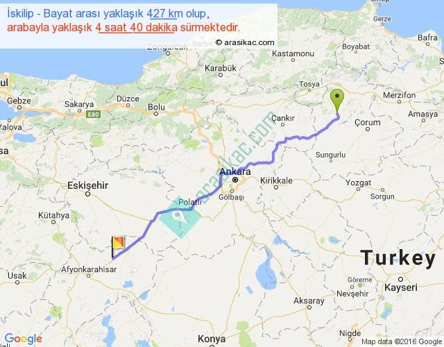İskilip - Bayat arası yaklaşık olarak 90 km/h ile yukarıda belirtilen sürede olup, iki yerin kuş uçuşu uzaklığı (mesafesi) 358'dir. Eğer belirtilen yerler arasında uçak seferi var ise bu süre uçakla 33 dakika'ya kadar düşebilir. Yolculuk otobüsle 6 saat 4 dakika sürmektedir.