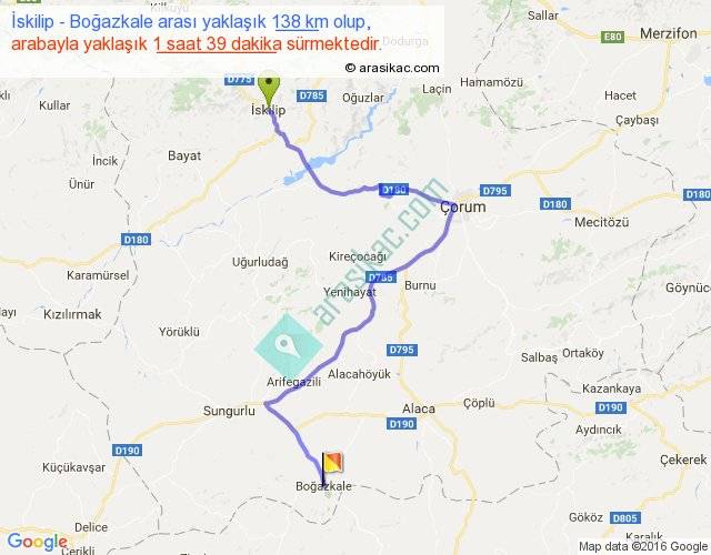 İskilip - Boğazkale arası yaklaşık olarak 90 km/h ile yukarıda belirtilen sürede olup, iki yerin kuş uçuşu uzaklığı (mesafesi) 79'dir. Yolculuk otobüsle 2 saat 8 dakika sürmektedir.