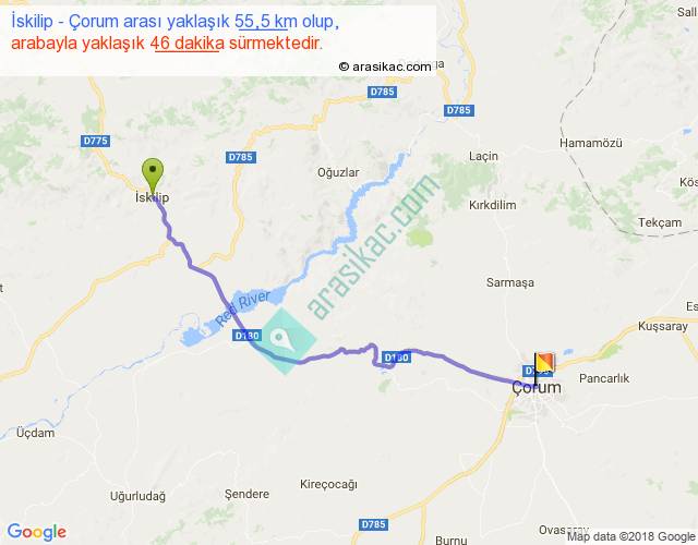 İskilip - Çorum arası yaklaşık olarak 90 km/h ile yukarıda belirtilen sürede olup, iki yerin kuş uçuşu uzaklığı (mesafesi) 45'dir. Yolculuk otobüsle 1 saat 1 dakika sürmektedir.