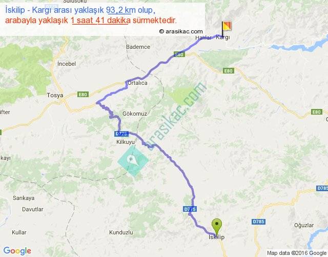 İskilip - Kargı arası yaklaşık olarak 90 km/h ile yukarıda belirtilen sürede olup, iki yerin kuş uçuşu uzaklığı (mesafesi) 45'dir. Yolculuk otobüsle 2 saat 11 dakika sürmektedir.