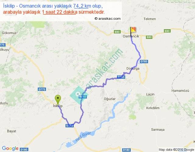 İskilip - Osmancık arası yaklaşık olarak 90 km/h ile yukarıda belirtilen sürede olup, iki yerin kuş uçuşu uzaklığı (mesafesi) 38'dir. Yolculuk otobüsle 1 saat 46 dakika sürmektedir.