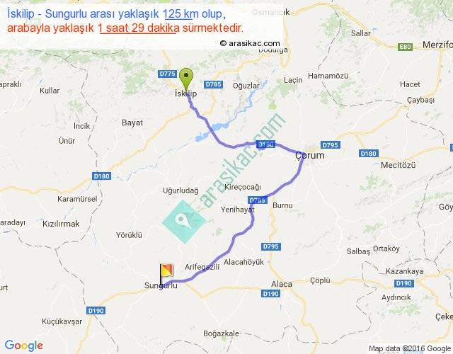 İskilip - Sungurlu arası yaklaşık olarak 90 km/h ile yukarıda belirtilen sürede olup, iki yerin kuş uçuşu uzaklığı (mesafesi) 63'dir. Yolculuk otobüsle 1 saat 54 dakika sürmektedir.