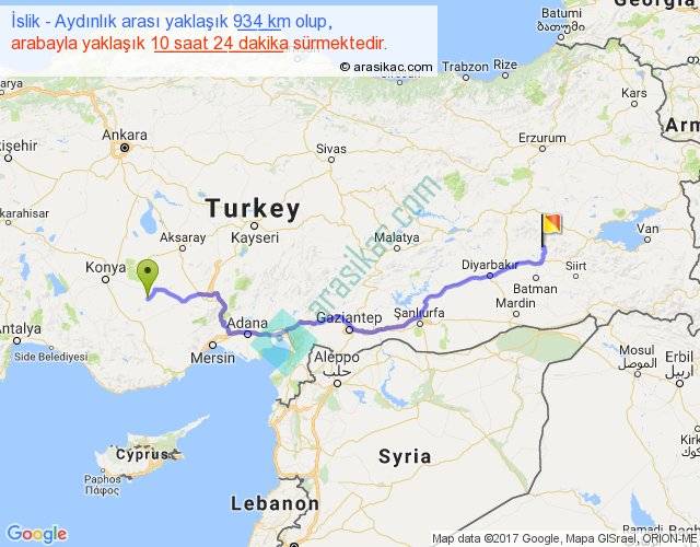 İslik - Aydınlık arası yaklaşık olarak 90 km/h ile yukarıda belirtilen sürede olup, iki yerin kuş uçuşu uzaklığı (mesafesi) 700'dir. Eğer belirtilen yerler arasında uçak seferi var ise bu süre uçakla 1 saat 04 dakika'ya kadar düşebilir. Yolculuk otobüsle 13 saat 31 dakika sürmektedir.