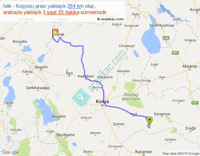 İslik - Koçyazı arası yaklaşık olarak 90 km/h ile yukarıda belirtilen sürede olup, iki yerin kuş uçuşu uzaklığı (mesafesi) 201'dir. Yolculuk otobüsle 4 saat 26 dakika sürmektedir.