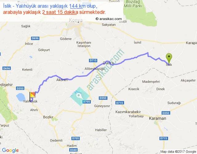 İslik - Yalıhüyük arası yaklaşık olarak 90 km/h ile yukarıda belirtilen sürede olup, iki yerin kuş uçuşu uzaklığı (mesafesi) 113'dir. Yolculuk otobüsle 2 saat 55 dakika sürmektedir.