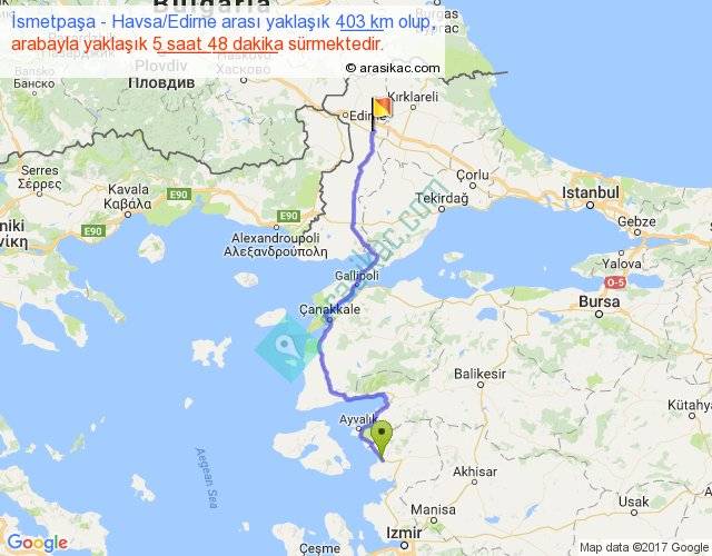İsmetpaşa - Havsa Edirne arası yaklaşık olarak 90 km/h ile yukarıda belirtilen sürede olup, iki yerin kuş uçuşu uzaklığı (mesafesi) 274'dir. Eğer belirtilen yerler arasında uçak seferi var ise bu süre uçakla 25 dakika'ya kadar düşebilir. Yolculuk otobüsle 7 saat 32 dakika sürmektedir.