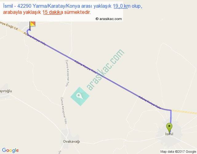 İsmil - 42290 Yarma Karatay Konya arası yaklaşık olarak 90 km/h ile yukarıda belirtilen sürede olup, iki yerin kuş uçuşu uzaklığı (mesafesi) 17'dir. Yolculuk otobüsle 19 dakika sürmektedir.