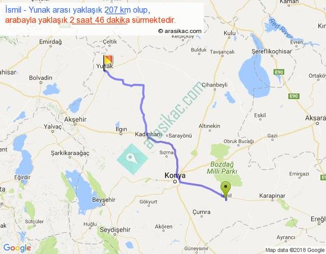 İsmil - Yunak arası yaklaşık olarak 90 km/h ile yukarıda belirtilen sürede olup, iki yerin kuş uçuşu uzaklığı (mesafesi) 166'dir. Yolculuk otobüsle 3 saat 35 dakika sürmektedir.
