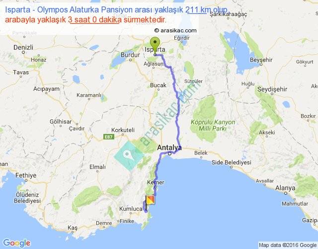 Isparta - Olympos Alaturka Pansiyon arası yaklaşık olarak 90 km/h ile yukarıda belirtilen sürede olup, iki yerin kuş uçuşu uzaklığı (mesafesi) 152'dir. Yolculuk otobüsle 3 saat 54 dakika sürmektedir.