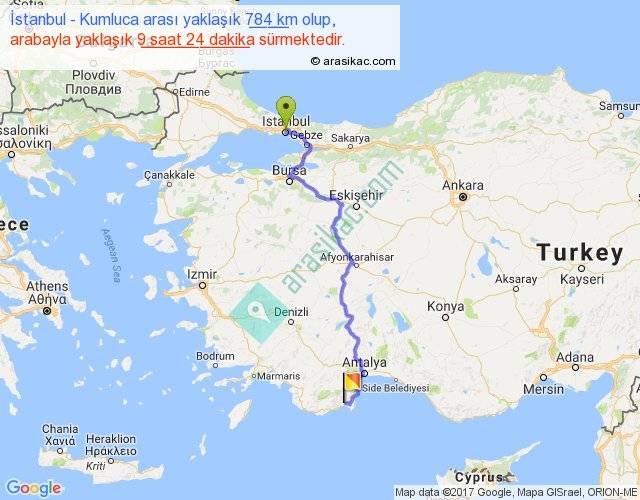 İstanbul - Kumluca arası yaklaşık olarak 90 km/h ile yukarıda belirtilen sürede olup, iki yerin kuş uçuşu uzaklığı (mesafesi) 525'dir. Eğer belirtilen yerler arasında uçak seferi var ise bu süre uçakla 48 dakika'ya kadar düşebilir. Yolculuk otobüsle 12 saat 23 dakika sürmektedir.