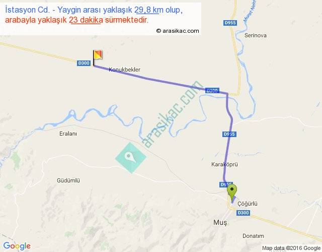 İstasyon Cd. - Yaygin arası yaklaşık olarak 90 km/h ile yukarıda belirtilen sürede olup, iki yerin kuş uçuşu uzaklığı (mesafesi) 23'dir. Yolculuk otobüsle 29 dakika sürmektedir.
