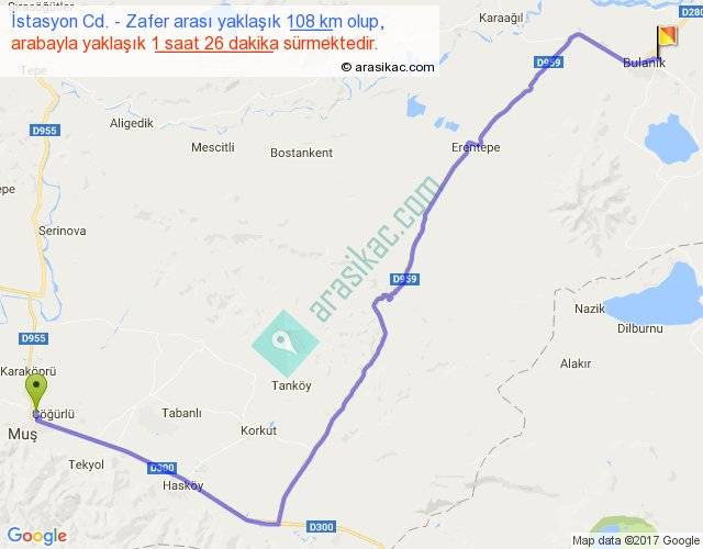 İstasyon Cd. - Zafer arası yaklaşık olarak 90 km/h ile yukarıda belirtilen sürede olup, iki yerin kuş uçuşu uzaklığı (mesafesi) 77'dir. Yolculuk otobüsle 1 saat 51 dakika sürmektedir.