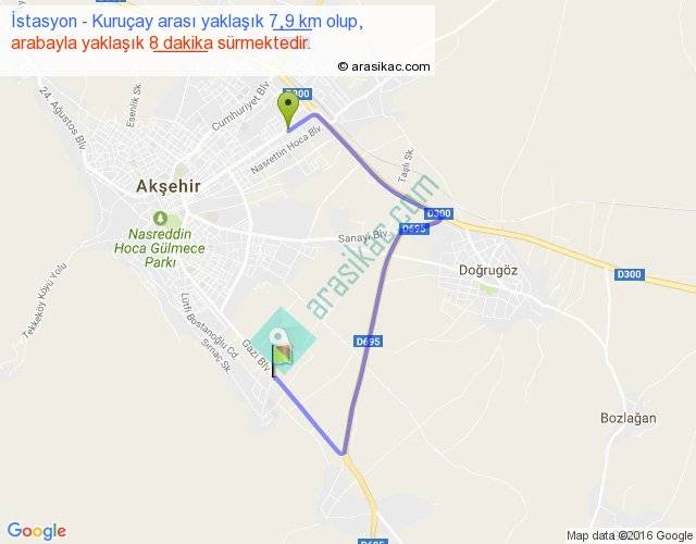 İstasyon - Kuruçay arası yaklaşık olarak 90 km/h ile yukarıda belirtilen sürede olup, iki yerin kuş uçuşu uzaklığı (mesafesi) 3'dir. Yolculuk otobüsle 10 dakika sürmektedir.