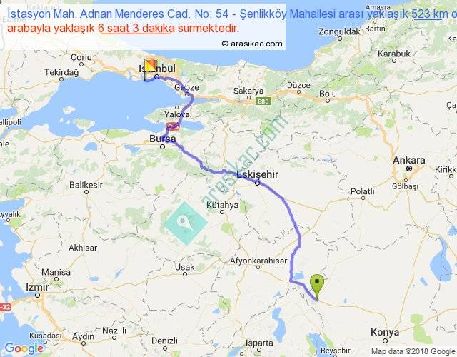 İstasyon Mah. Adnan Menderes Cad. No: 54 - Şenlikköy Mahallesi arası yaklaşık olarak 90 km/h ile yukarıda belirtilen sürede olup, iki yerin kuş uçuşu uzaklığı (mesafesi) 365'dir. Eğer belirtilen yerler arasında uçak seferi var ise bu süre uçakla 33 dakika'ya kadar düşebilir. Yolculuk otobüsle 7 saat 51 dakika sürmektedir.